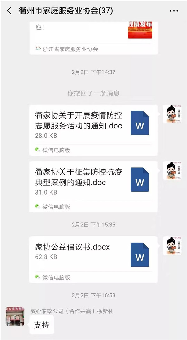 省家協(xié)副會長、衢州市家協(xié)會長單位,衢州半邊天家政服務(wù)有限公司第一時間采購大量的防護(hù)物資,及時發(fā)放,盡最大的努力保障在崗人員的身體健康,并對家政人員動態(tài)去向和健康狀況進(jìn)行了解核實(shí),嚴(yán)格篩查。羅姿會長表示從自身給行業(yè)做表率,堅守誠信,禁止任何服務(wù)收費(fèi)漲價行為,積極與客戶溝通,妥善處理因疫情形成的業(yè)務(wù)調(diào)整,對客戶合理需求給予充分保障。衢州市家協(xié)也向全市企業(yè)和員工發(fā)出了《衢州市家庭服務(wù)業(yè)協(xié)會公益倡議書》以及《關(guān)于開展疫情防控志愿者服務(wù)活動的通知》,積極參與疫情防控。